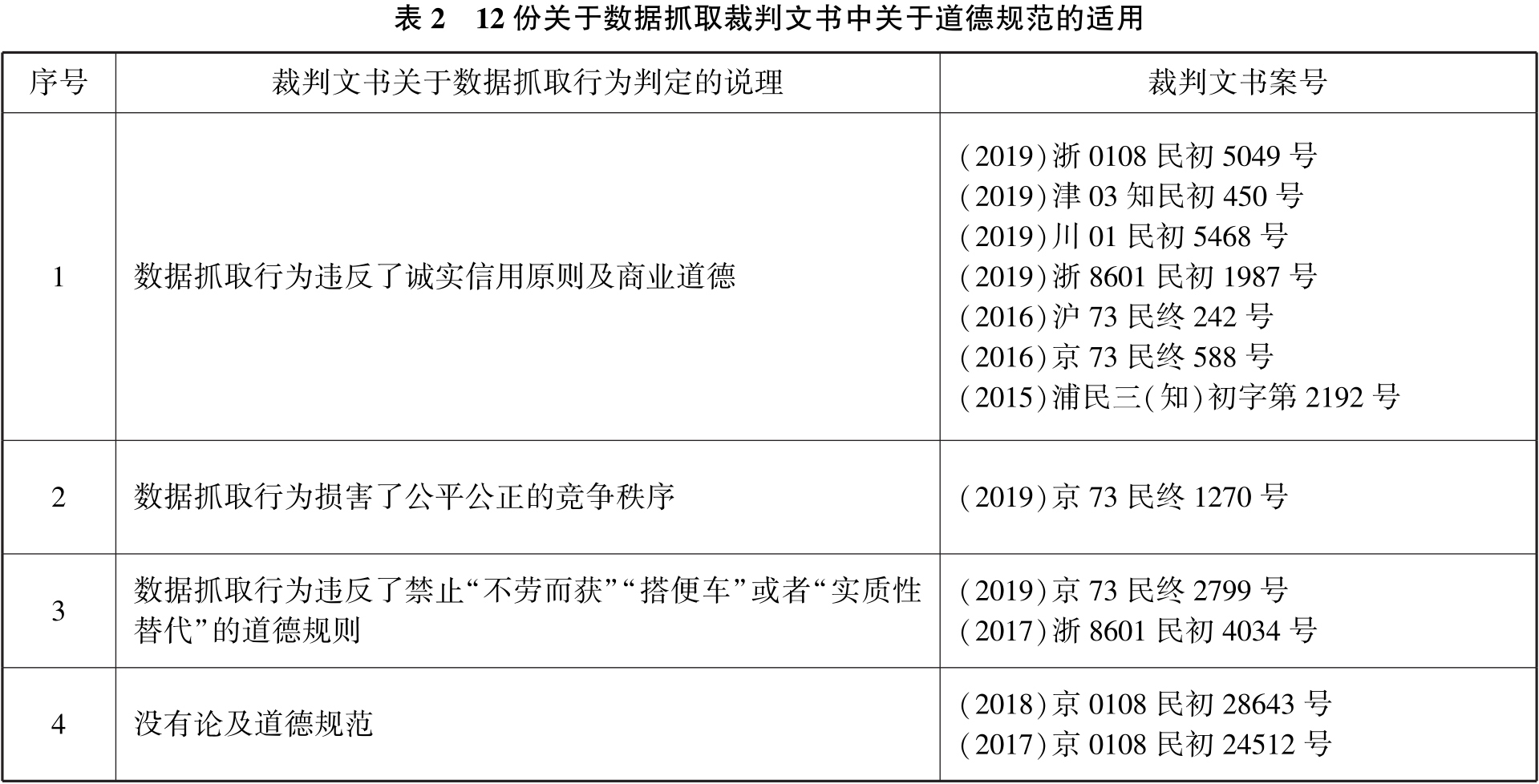 [11]。是故,法院在识别损害的基础上还需要进一步对数据抓取行为的正当性进行判定。在此阶段中,法院常常倾向于运用“诚实信用原则及商业道德”的道德原则以及由这些道德原则所引申出的行业惯例、自律公约等道德规则以衡量数据抓取行为的正当性(见表2)。