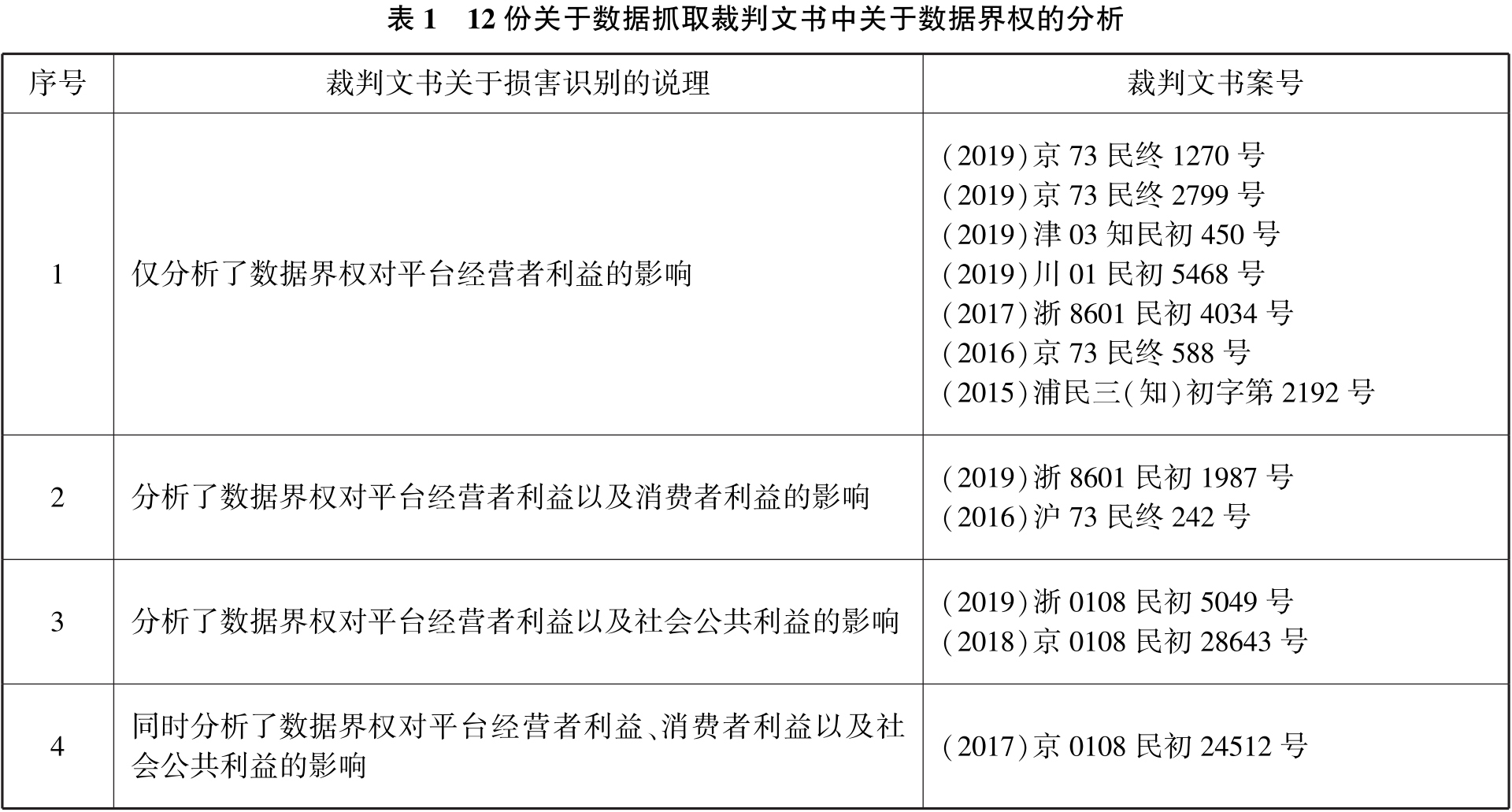 [5]。审视数据抓取纠纷案可以发现,多数法院对于数据权益的界定往往偏向于平台经营者一方的利益考量,同样重要的互联网消费者利益以及社会公共利益则常常难以得到关注(见表1)。