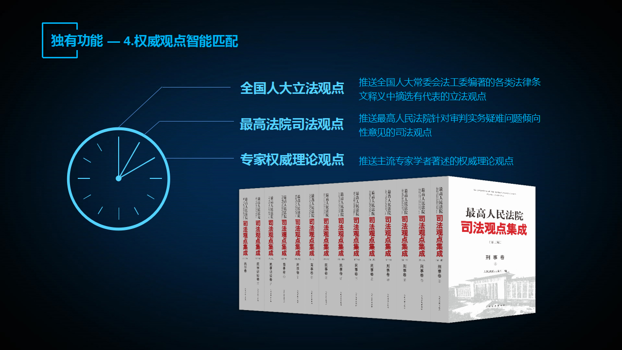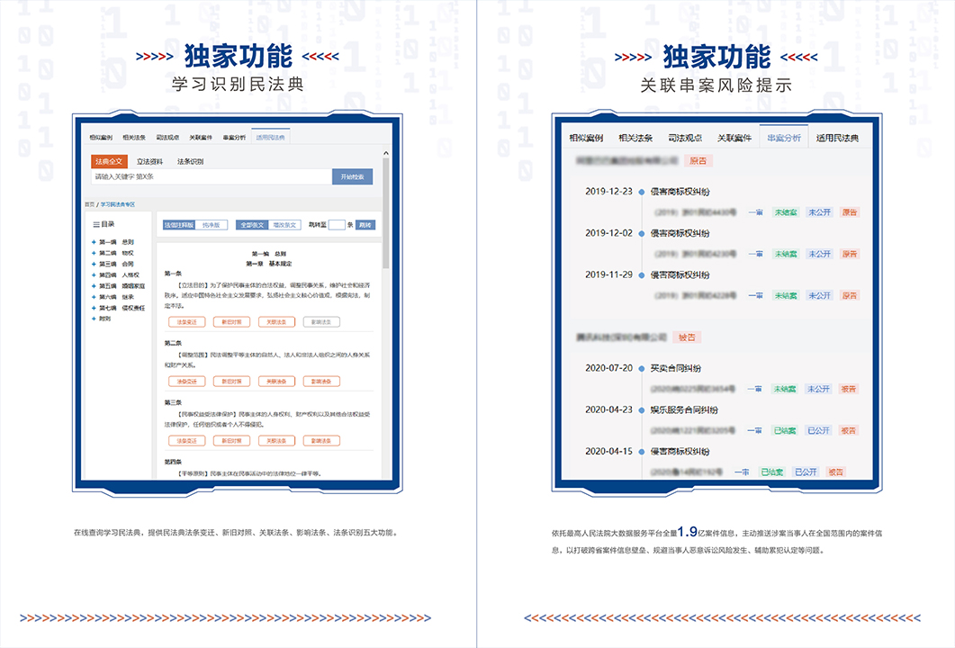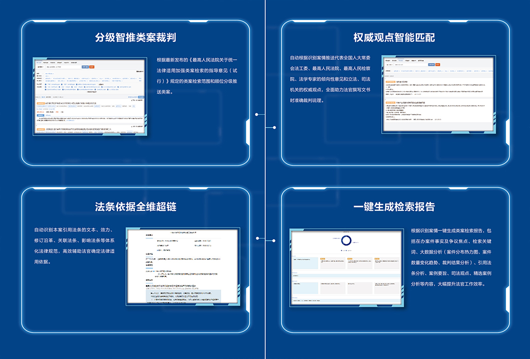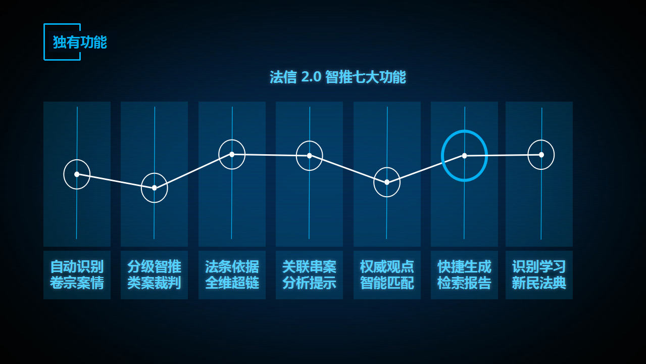 “法信2.0智推系统”高度集约化七大核心功能。包括:自动识别卷宗案情、分级智推类案裁判、法条依据全维超链、关联串案分析提示、权威观点智能匹配、快捷生成检索报告、识别学习新民法典。