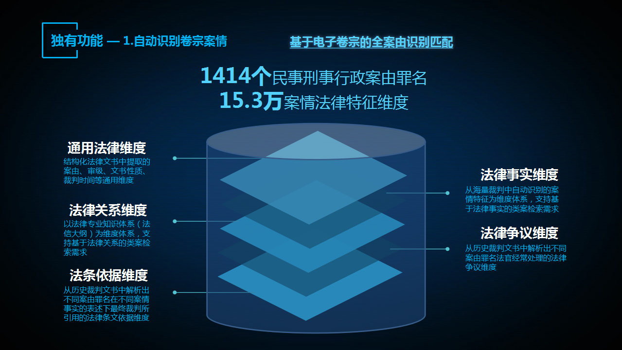 “法信2.0智推系统”的核心功能是实现基于个案电子卷宗的全案由识别匹配。这是系统最核心的技术能力,实现了法律关系、法律事实、法律争议、法条依据和通用法律属性多达5层维度的体系化融合,进而完成了对1414个案由罪名,总量达15.3万的法律维度体系的搭建。
