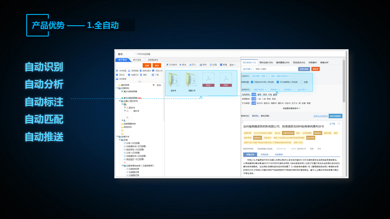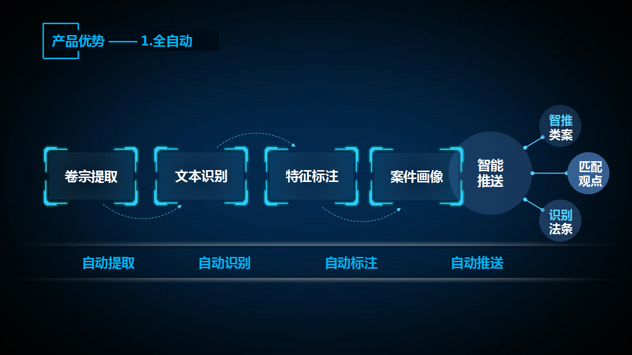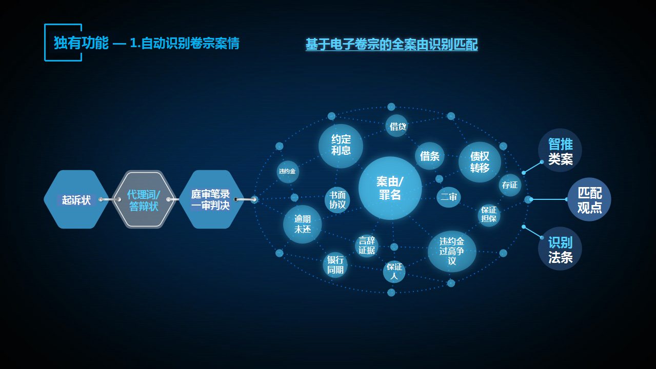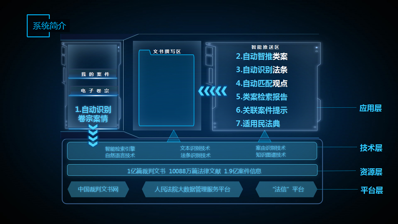 基于此,系统就可以从电子卷宗中各类结构化和半结构化的法律文本里,自动提取识别案情特征,进而实现一案一画像,一案一推送。