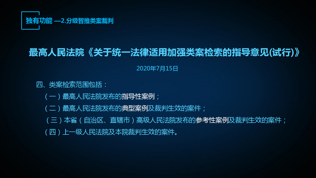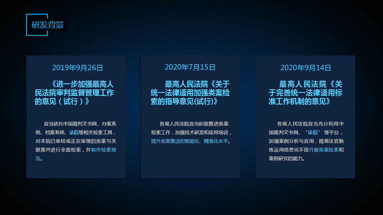 特别是今年先后下发了《关于统一法律适用加强类案检索的指导意见》《关于完善统一法律适用标准工作机制的意见》,在这些文件中都对利用信息化手段提升类案推送的智能化、精准化水平提出了明确要求。