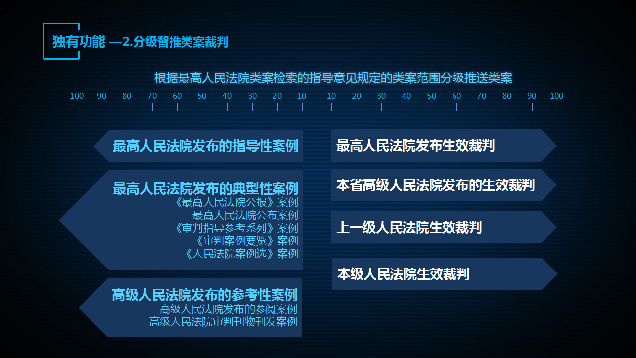 “法信2.0智推系统”首先严格按照最高人民法院的要求,对典型案例和裁判文书进了精准的分类标注和分类推送。案例推送按照意见所规定的最高人民法院指导性案例、典型性案例和高级人民法院发布的参考性案例进行三级分类。裁判推送按照最高人民法院、本省高院、上级法院、本级法院进行四级分类。