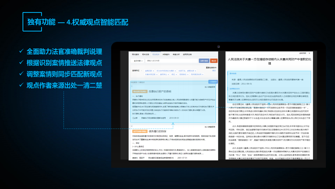 “法信2.0智推系统”嵌入办案平台和电子卷宗数据对接后,能够在法官所使用的办案系统中,提供类案、法条、观点三类自动智推、自动匹配的知识服务,同时根据法官需求,系统还一键生成类案检索报告、关联串联案件提示和适用民法典三项特有功能。