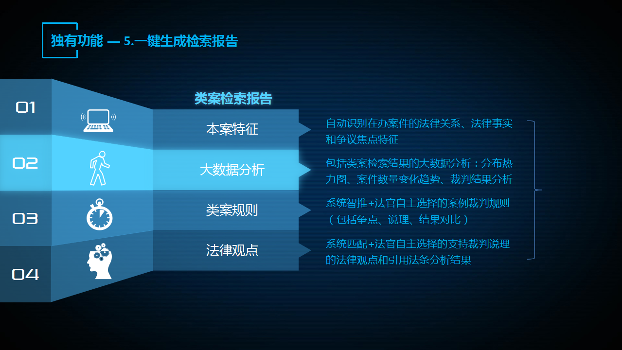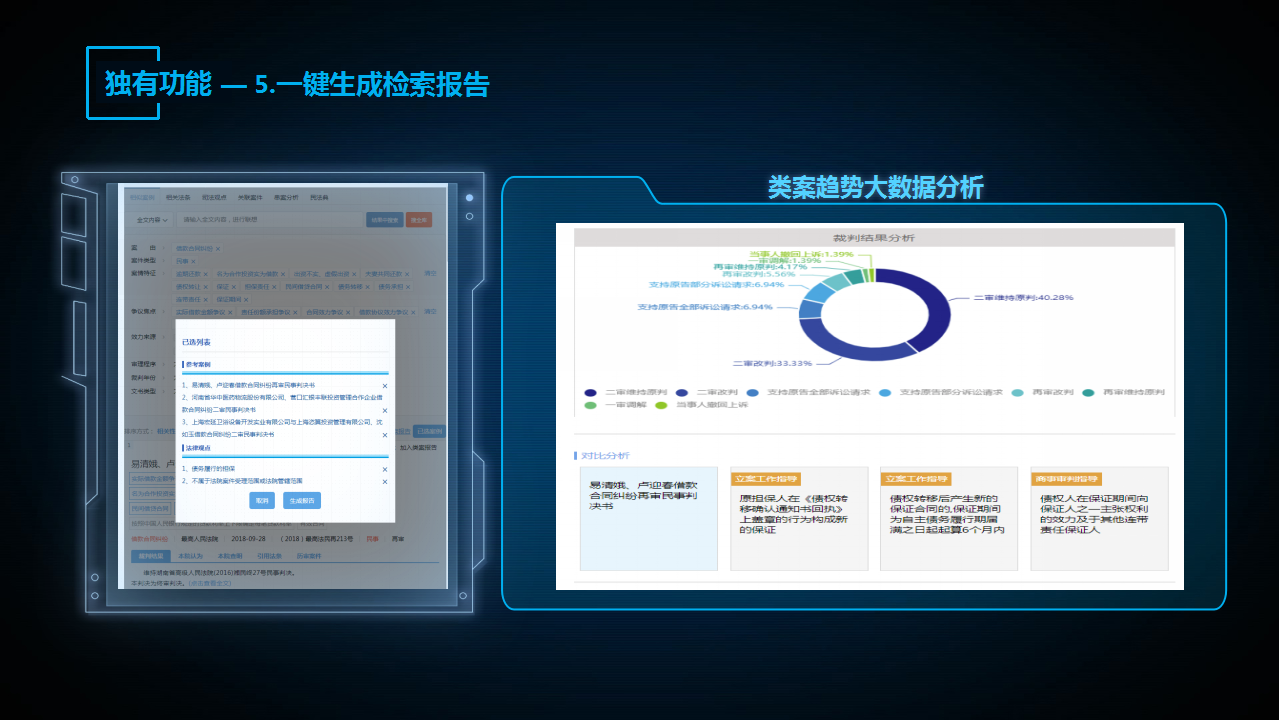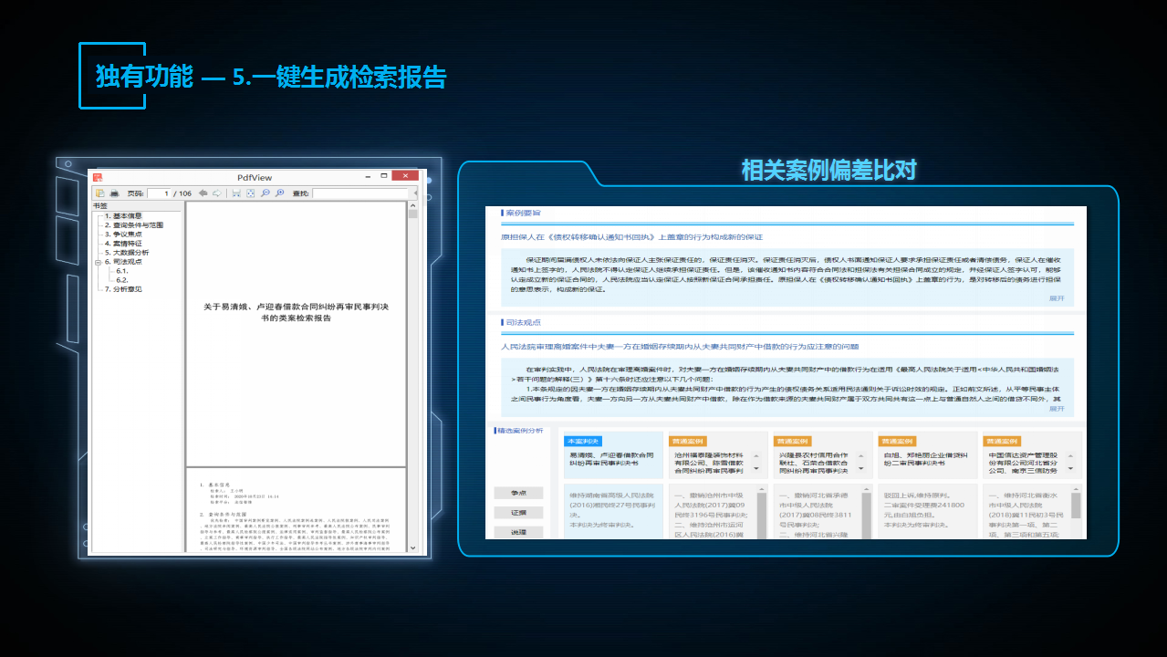 类案检索报告中所列入的类案和观点,既包括系统智能推送的,也可以由法官自主选择。法官在系统中选择完类案和观点加入检索报告后,系统会自动从案情特征、争议焦点等方面对本案和类案进行偏差比对,并自动将选择的类案规则、法律观点、系统生成的案情比对、大数据分析合并成一个完整的报告下载供法官使用。