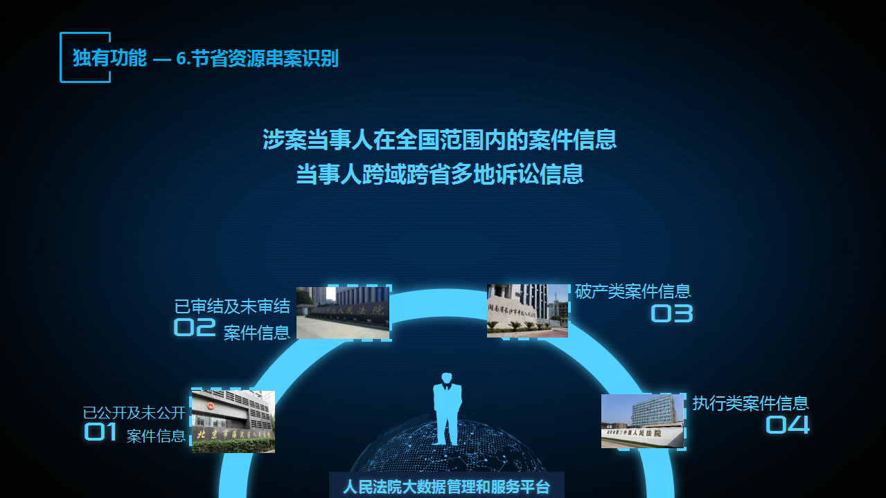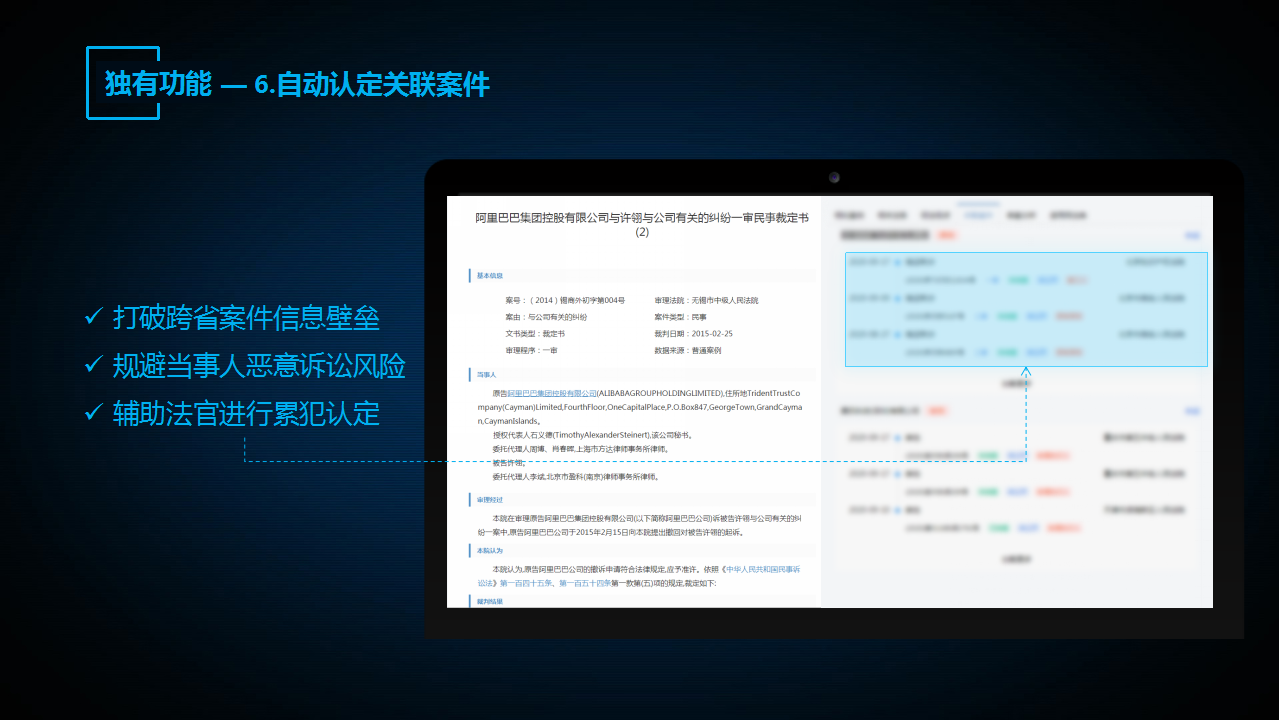 “法信2.0智推系统”的第六个功能,是基于人民法院大数据管理和服务平台的全量案件信息,对同一当事人跨域跨省的多地诉讼案件进行自动认定,从而规避当事人恶意诉讼风险,辅助法官进行累犯认定。