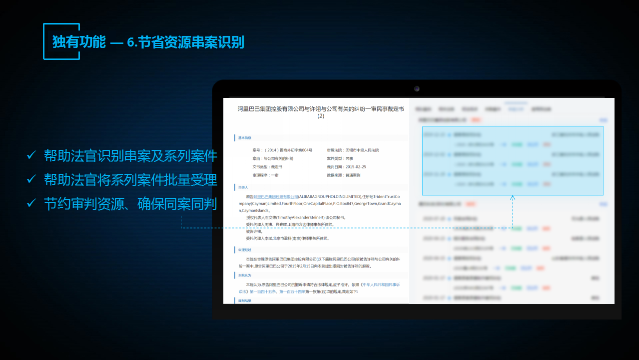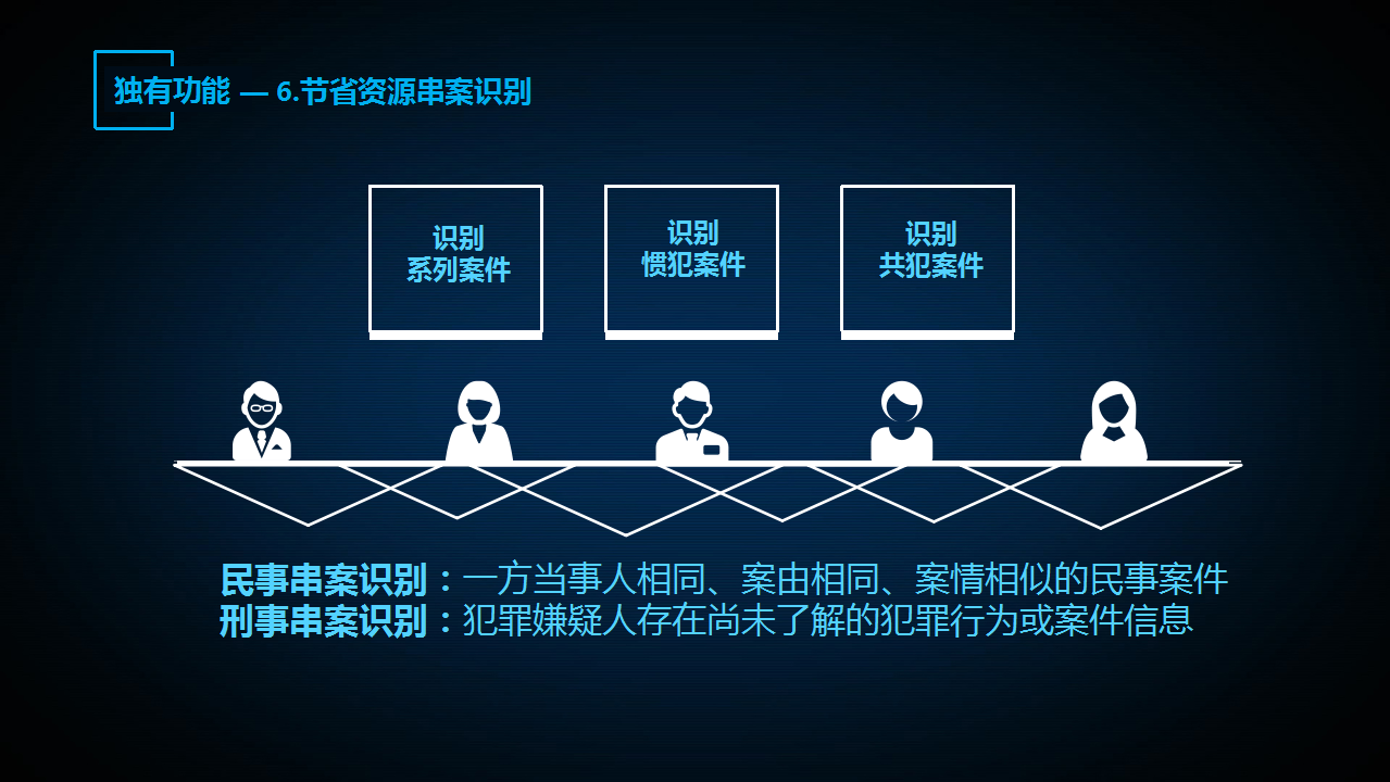 “法信2.0智推系统”还能从法院类案大数据信息中快速识别出民事案件中一方当事人相同、案由相同、案情相似的串案和刑事案件中犯罪嫌疑人存在尚未了解的犯罪行为或案件信息。从而快速识别串案和系列案件,提高系列案件批量受理的效率,节约审判资源。