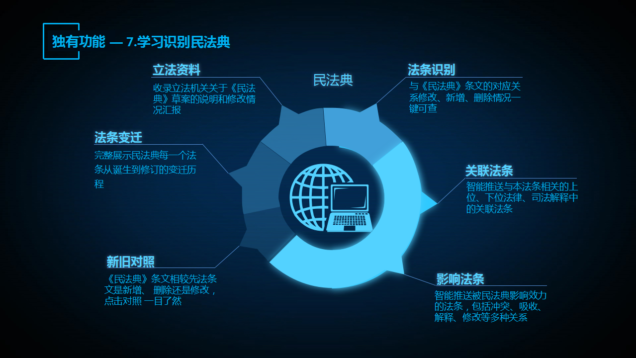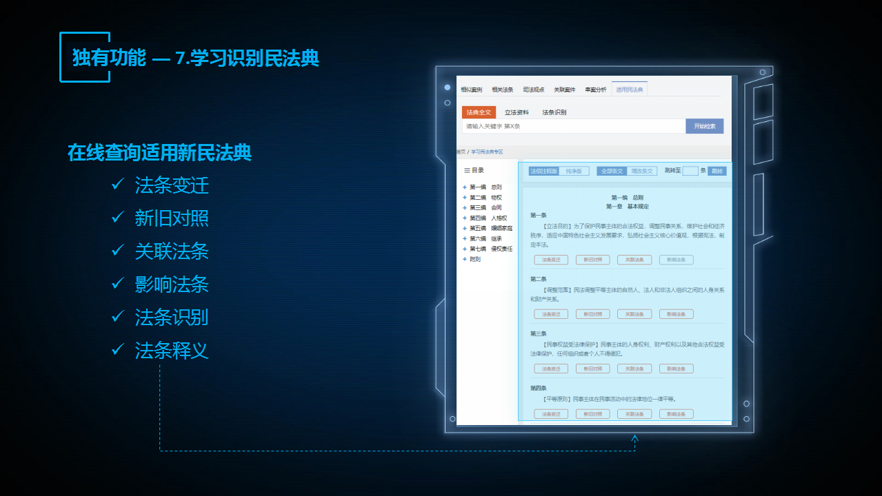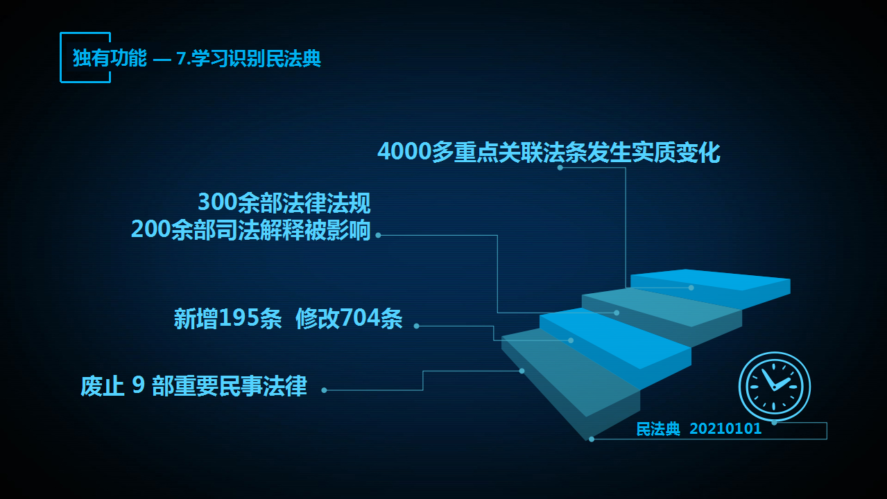 “法信2.0智推系统”的第七个功能是学习识别民法典功能。民法典即将在2021年1月1日施行,据不完全统计,至少还有277部法律法规、219部司法解释,涉及法官办案常用近4000条重点关联法条会受到效力影响和变化。