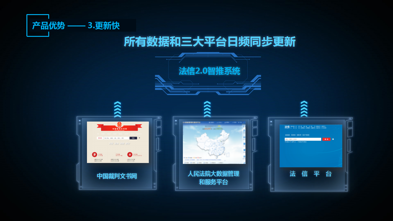 依托中国司法大数据研究院的分布内存处理技术,在过亿案件的数据池中,对一个案件的几十项类案特征同时和十万级的类案维度进行并发匹配与识别推送,全部达到了一秒内响应,大量节省了法官的时间,提升了用户体验。“法信2.0智推系统”与裁判文书网、人民法院大数据管理平台、法信平台的数据同步更新。