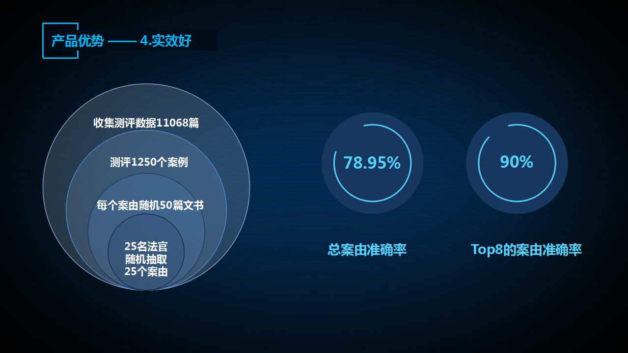 经过第三方初步测评(组织25名法官对随机抽取的25个案由、1250个案例、11068篇文书进行了测评),准确推送的文书为8698,整体准确率为78.59%,其中民事和刑事常用的top8的案由罪名的准确率均在90%以上。“法信2.0智推系统”在辽宁、苏州、深圳等地法院部署应用,反响良好(参见衍生阅读)。