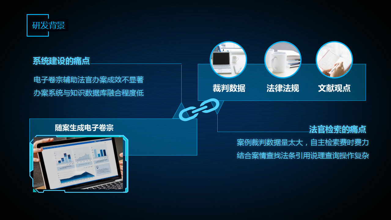 智慧法院建设过程中,一方面快速聚集了大量能为法官办案提供知识服务的类案、法律、文献观点等中台数据;另外一方面随电子卷宗随案同步生成工作的推进,每一个个案又形成了丰富的案卷文本信息。但是两套系统各自独立,没有融合发挥倍增功效。从法官检索的角度来看,案例裁判的数据量越来越大,投入检索的时间精力也越多。从信息化建设的角度来说,电子卷宗所发挥的辅助法官办案的成效不够显著。所以将知识服务类的数据中台与办案卷宗系统的最后一公里打通,让两个系统相融合迫在眉睫。