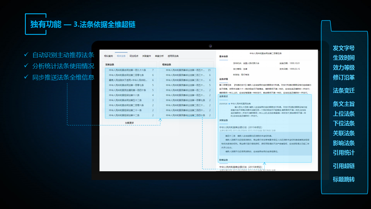 “法信2.0智推系统”对法官推送法律依据遵循“先做减法,再做加法”的原则。“先做减法”是指基于案情识别,系统给法官推送的都是具体的法条,而不是整篇的法律。“再做加法”是指针对已经确定引用的法律条文,系统会把该条文的效力等级、修订沿革、条文主旨、上下位法条、关联法条、影响法条进行了全维度的推送,真正帮助法官把要正式引用条文吃透,准确适用。