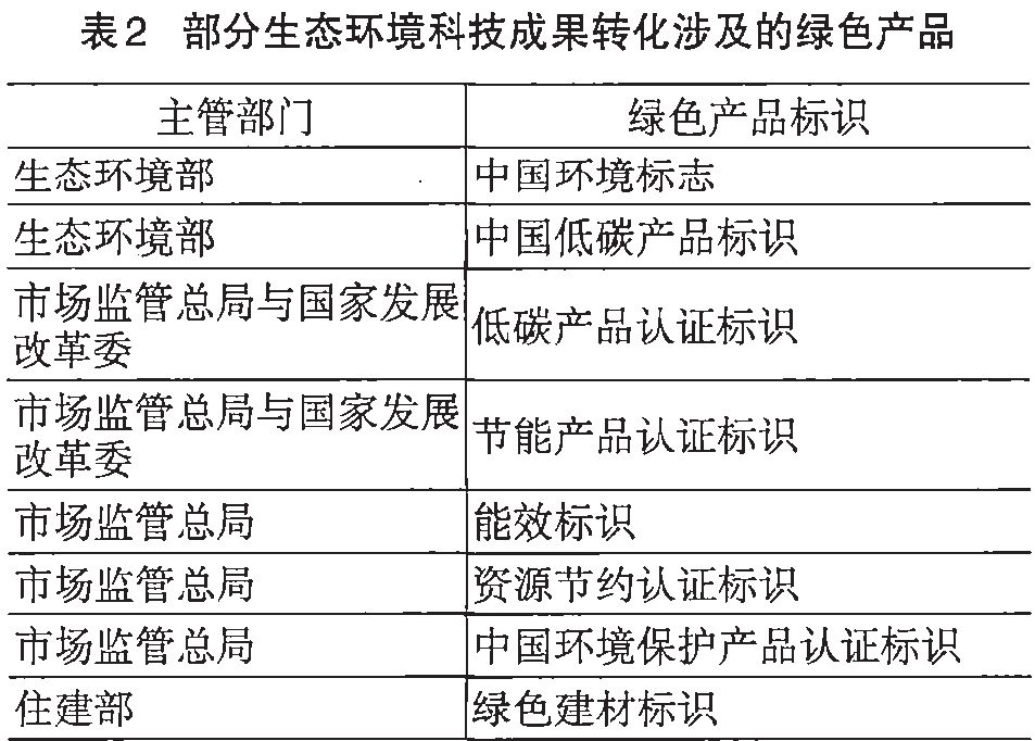[14]。在此种模式下,生态环境科技成果转化的绿色产品涉及的标识具有复杂性,见表2,不同认证标识的认证标准、认证程序,引致重叠认证、认证水平不统一的风险,如出现经过认证的装备、技术质量参差不齐,结果就是应用转化成果的企业在示范项目推广时遇到用户认知度差、认可度低的问题。除此之外,政府监管机构将标识认证的市场规制权“转委托”给第三方认证机构,其“认证权”的权利性质被认为是国家权力的私法化